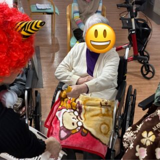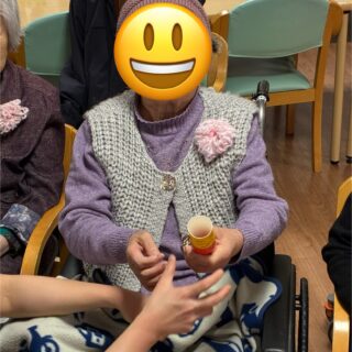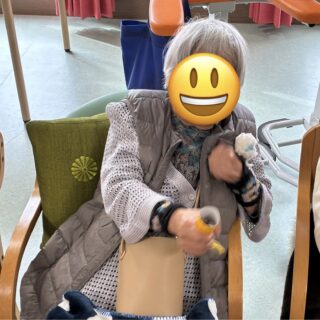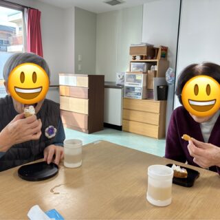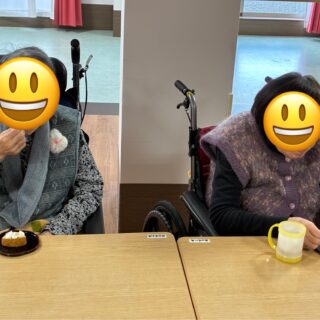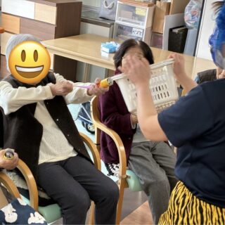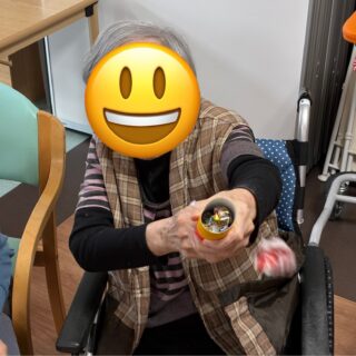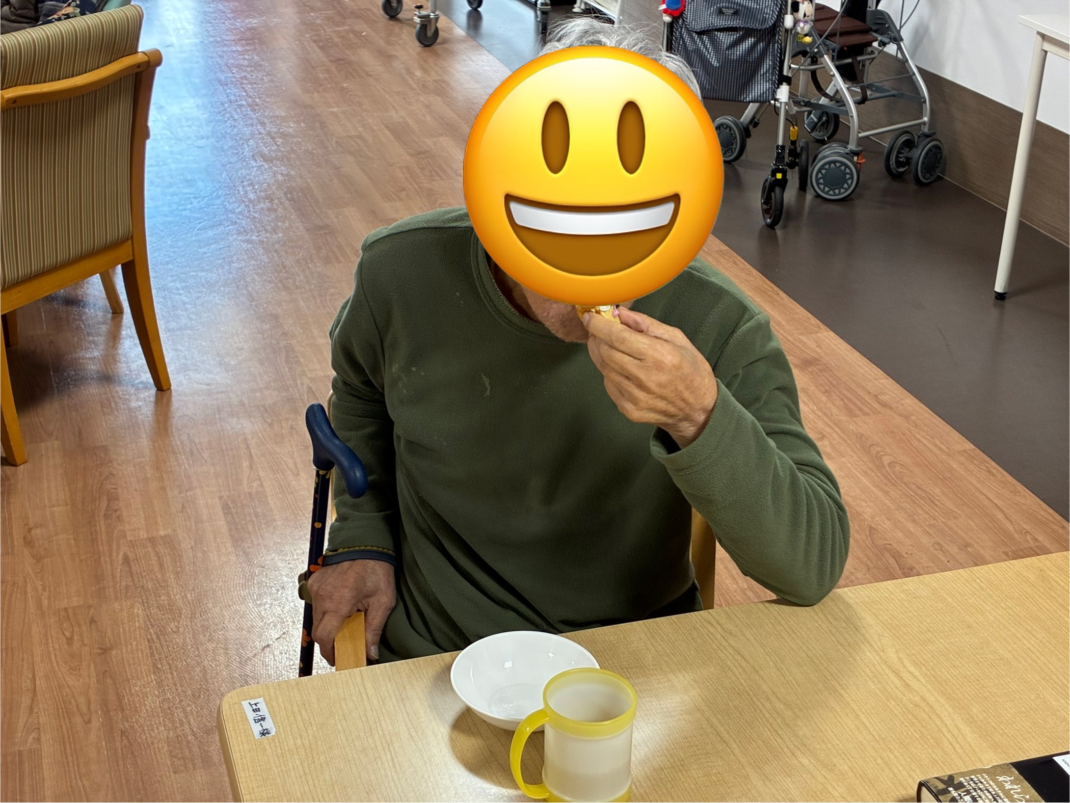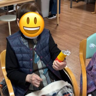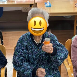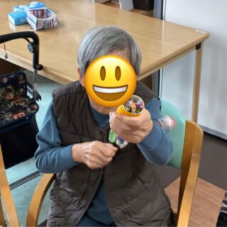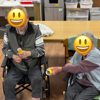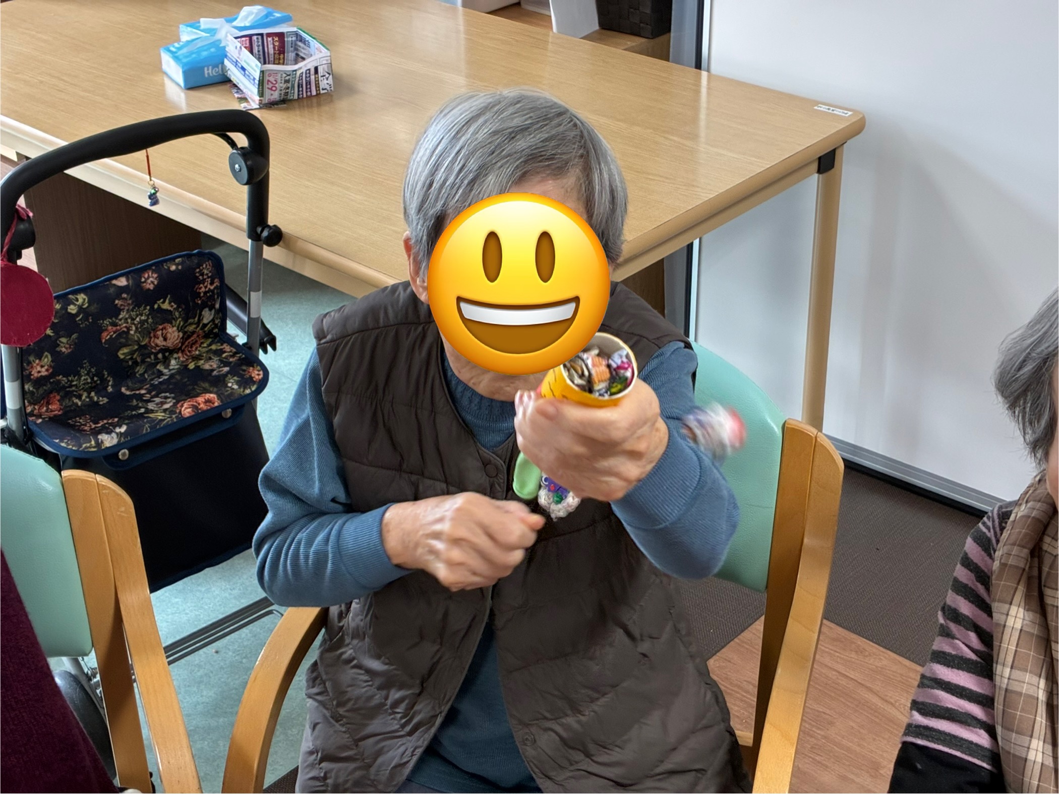 本日は節分の日なので豆撒きを行いました😊手作りのクラッカーで鬼に向かって新聞紙を丸めた球を発射!😁ポーンと上手に発射される方や苦戦している方など様々でしたが、皆様楽しんでおられました🥰おやつには鬼のデコレーションをしたバームクーヘンを皆様に召し上がって頂きました😁皆様「かわいいな🤗」「やっぱり甘いものは美味しいわ!」と大変満足そうに召し上がっておられました😁