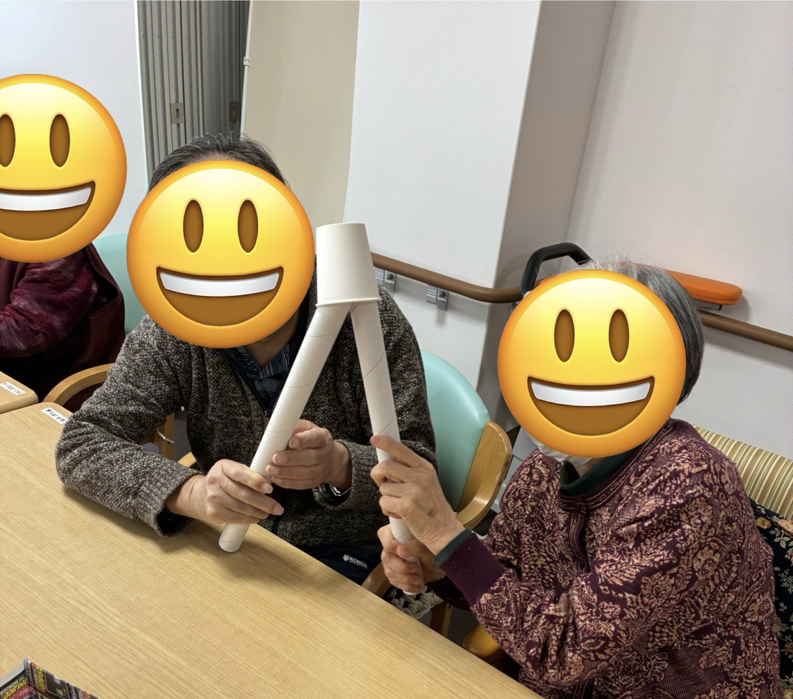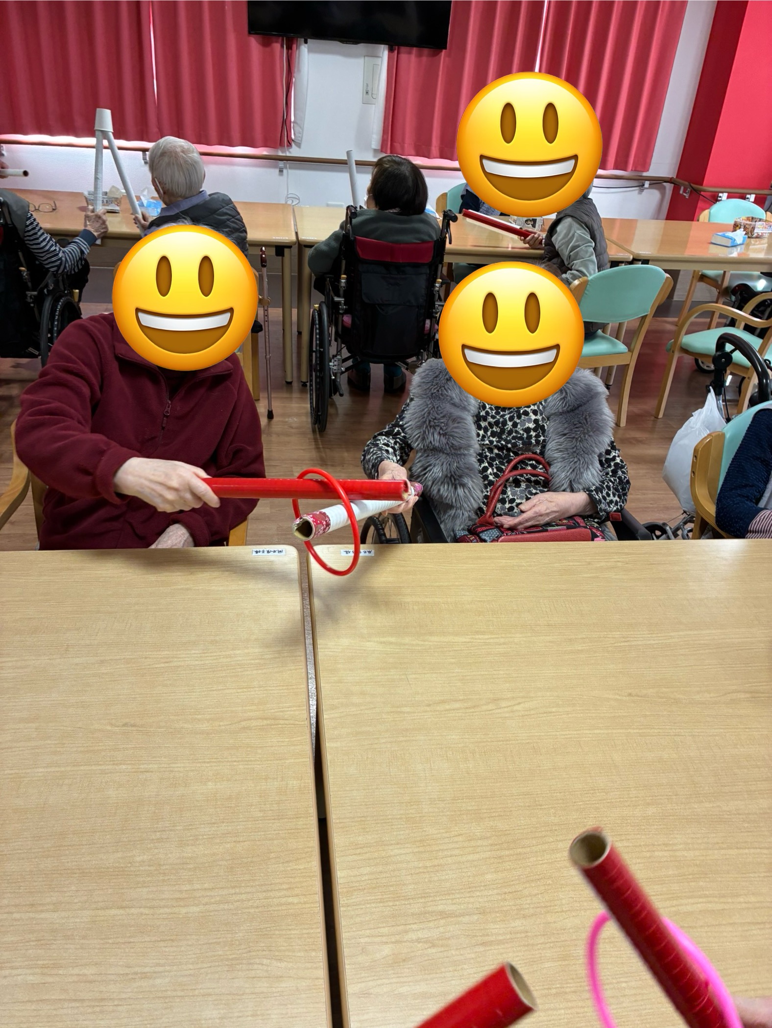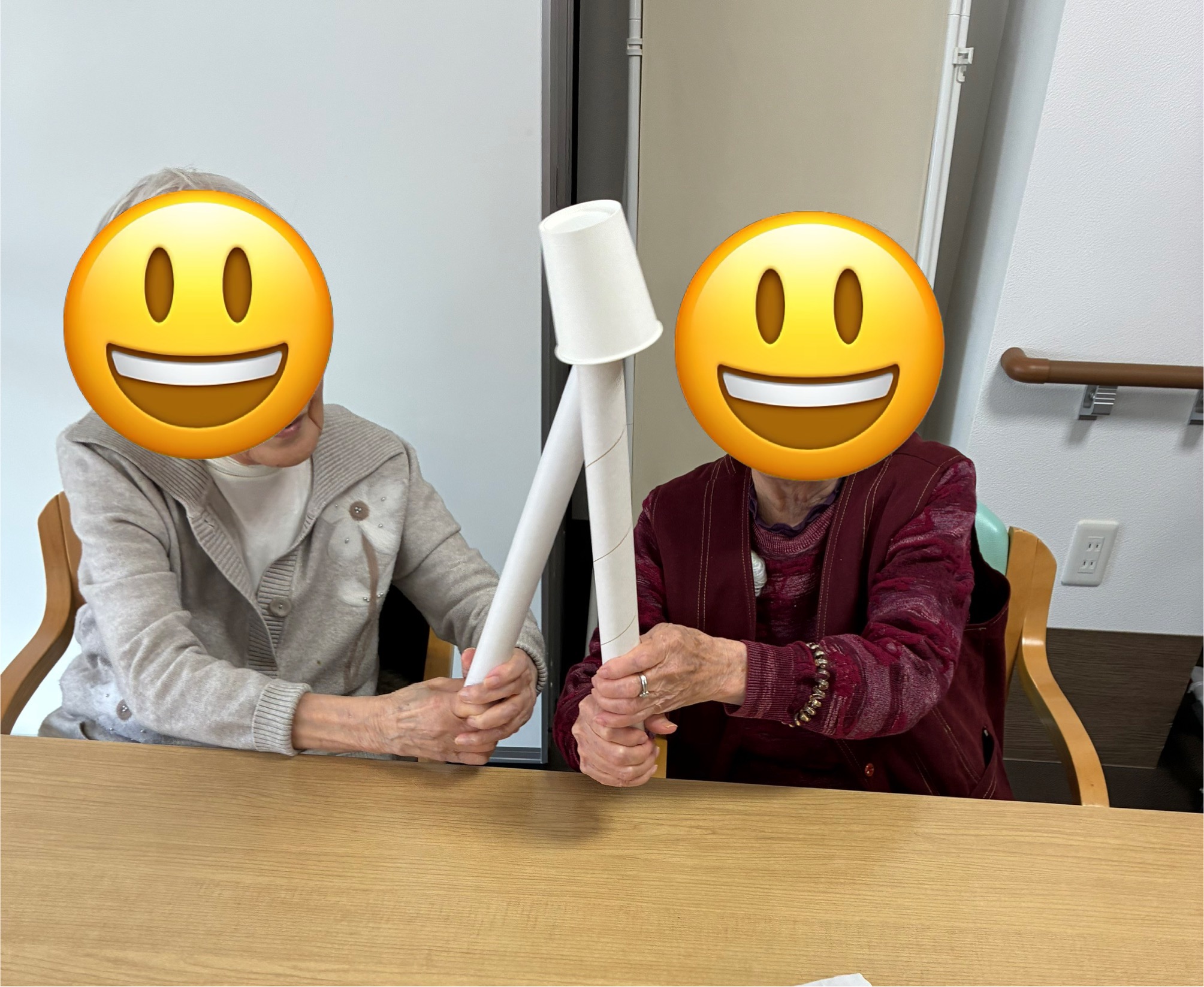 本日のレクは紙コップリレーを開催しました😁紙コップを棒で隣の方にリレーしていただきました🥰紙コップが小さく苦戦されていましたが、皆様一生懸命頑張っておられました😊棒の後は輪っかでリレーを行いました😊輪っかの方は簡単すぎたのか皆様あっという間にゴールしておられました🤗
