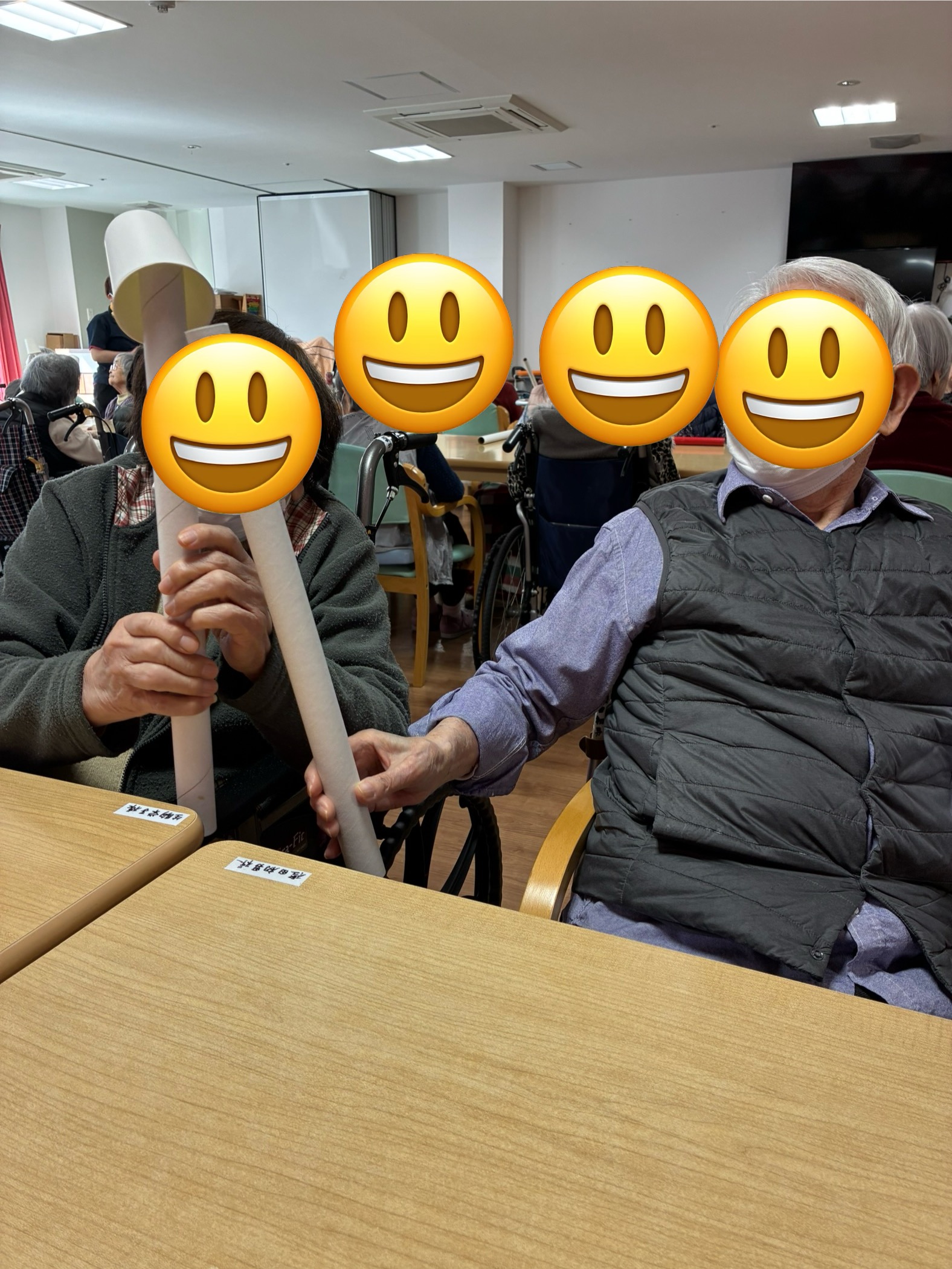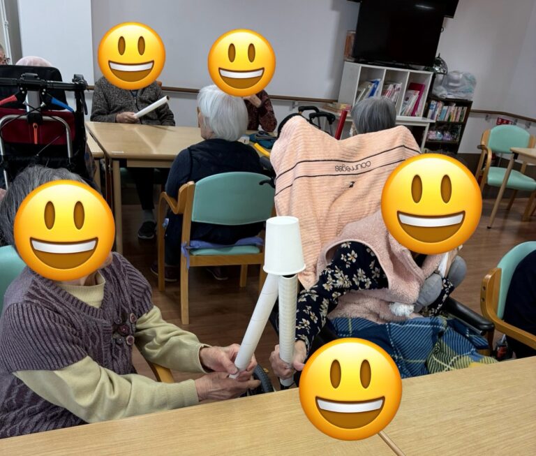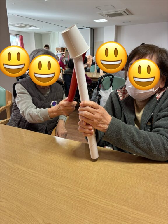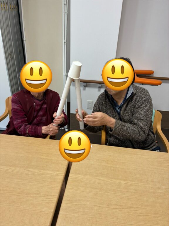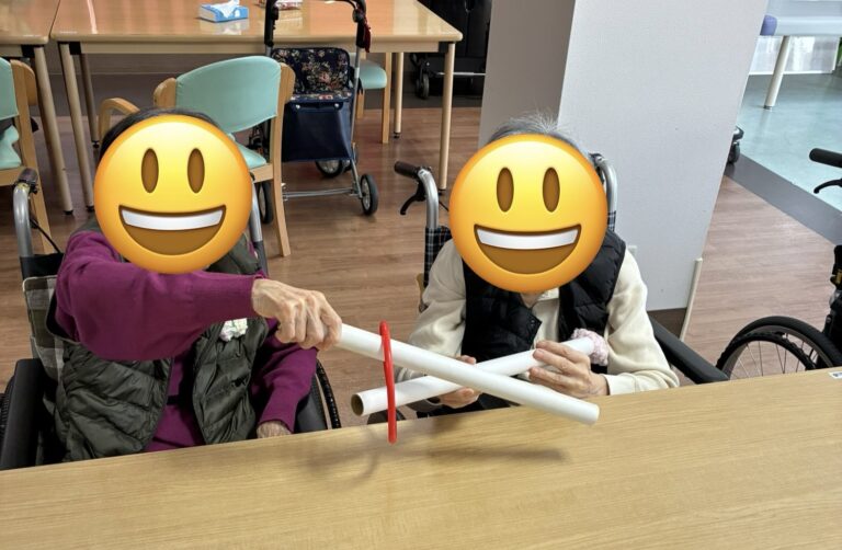 本日のレクは紙コップリレーを開催しました😁紙コップを棒で隣の方にリレーしていただきました🥰紙コップが小さく苦戦されていましたが、皆様一生懸命頑張っておられました😊棒の後は輪っかでリレーを行いました😊輪っかの方は簡単すぎたのか皆様あっという間にゴールしておられました🤗
