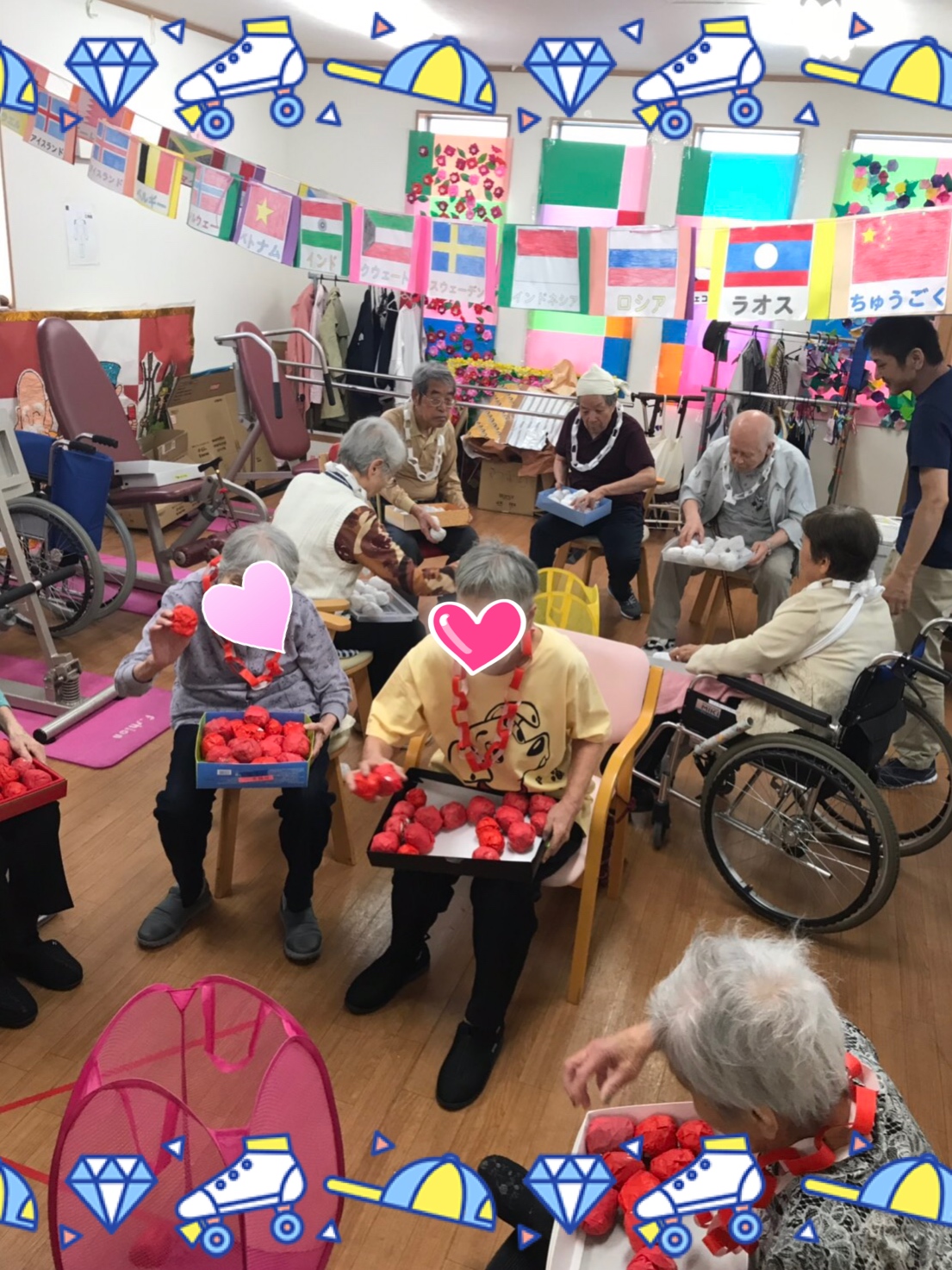 今年も運動会の季節がやってきました。今年は、利用者様が参加した種目は、紅白の玉入れ、パン食い競争です。皆様、負けん気を出して、頑張っておられます。職員の二人羽織では、熱いカップ麺を食べたり、コップでお茶を飲んだり、悪戦苦闘をしました