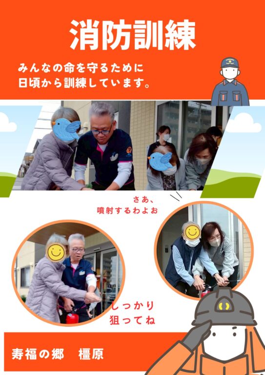 今日は消防訓練の日です。寿福の家橿原(ディサービス)と寿福の郷橿原(有料老人ホーム)合同です。スタッフと一緒に消火器の使い方を体験し、笑顔で真剣に取り組みました。いざという時のために、安心・安全を守る大切な時間でした。