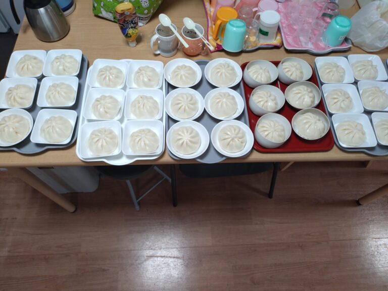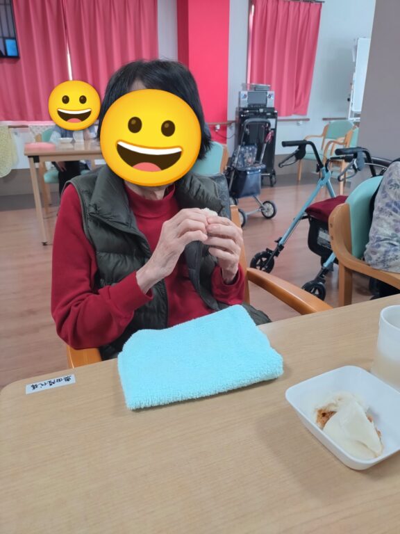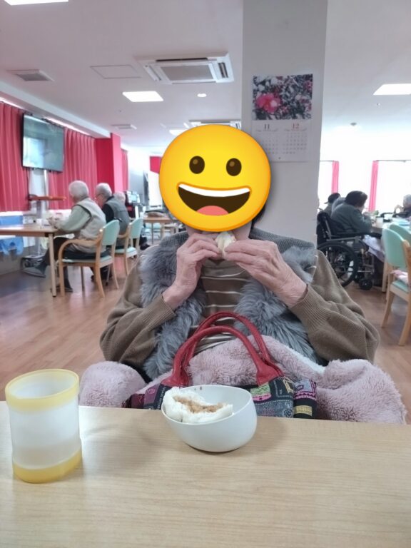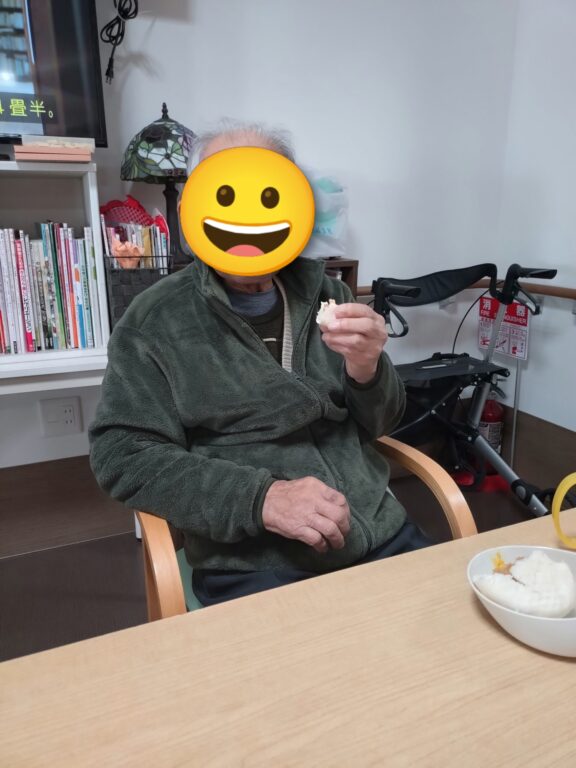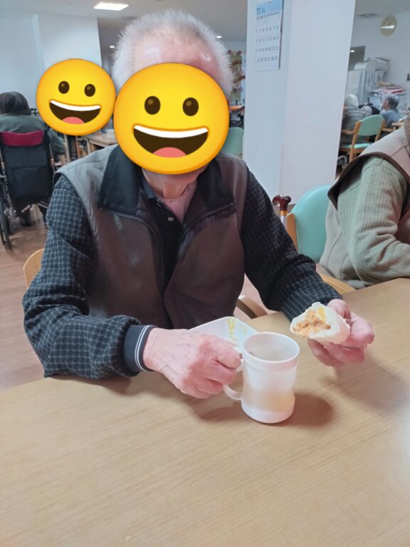 日曜日のおやつは豚まんを皆様に召し上がっていただきました😁豚まんに「からし・ポン酢・醤油」を選んで頂き、熱々の豚まんを緑茶と一緒に皆様召し上がっておられました👨👴