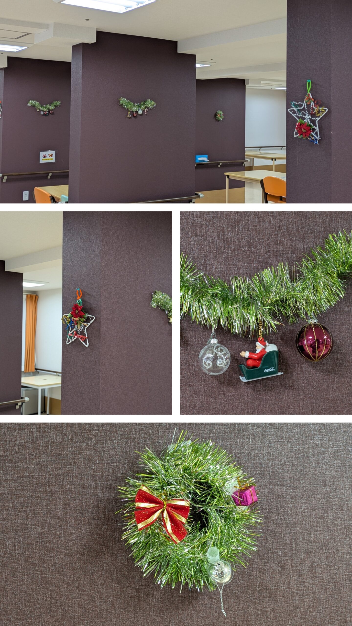 ツリーやリースを飾り、館内が一気にクリスマスの雰囲気に包まれ