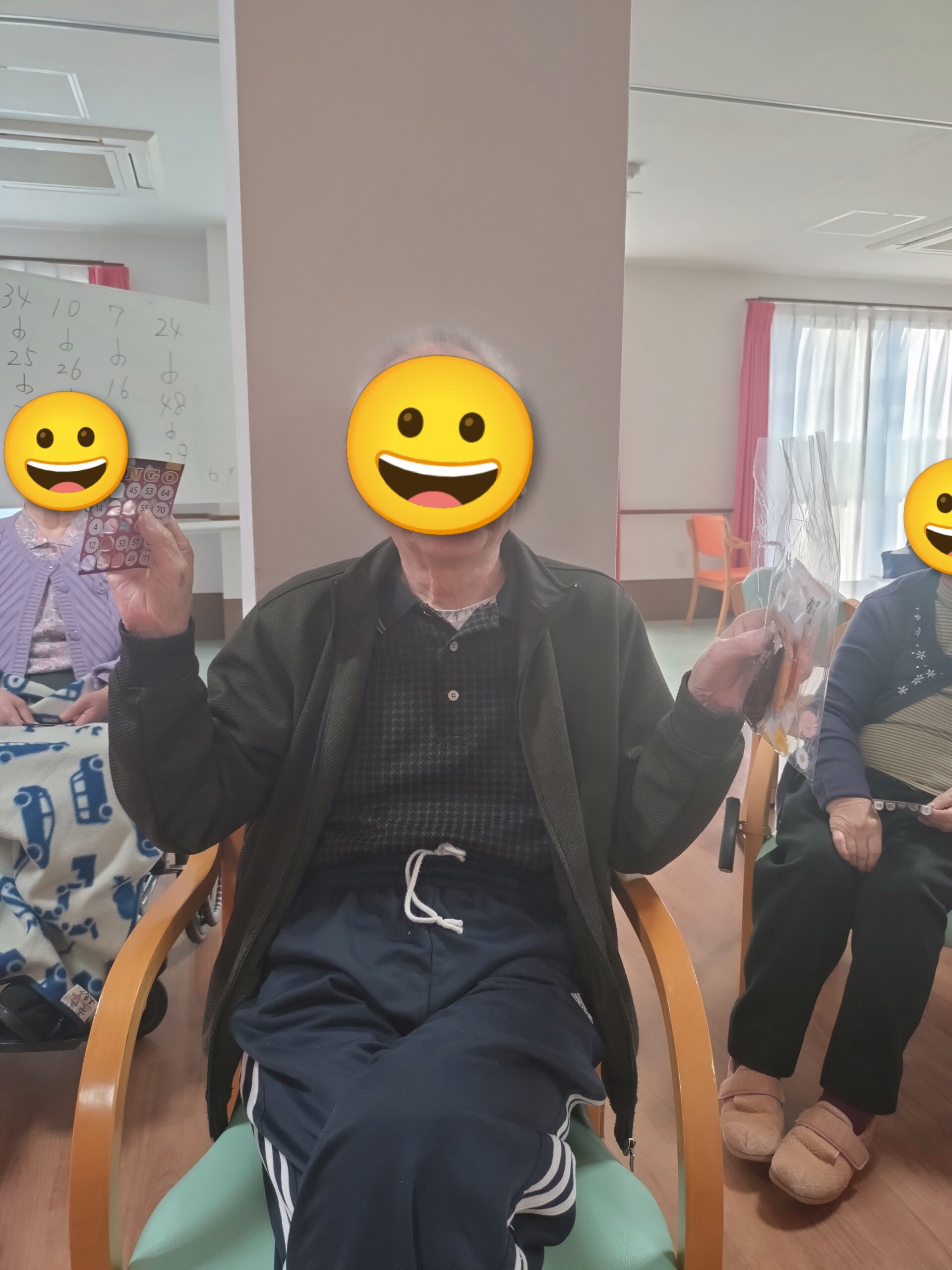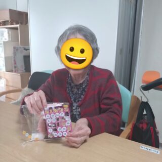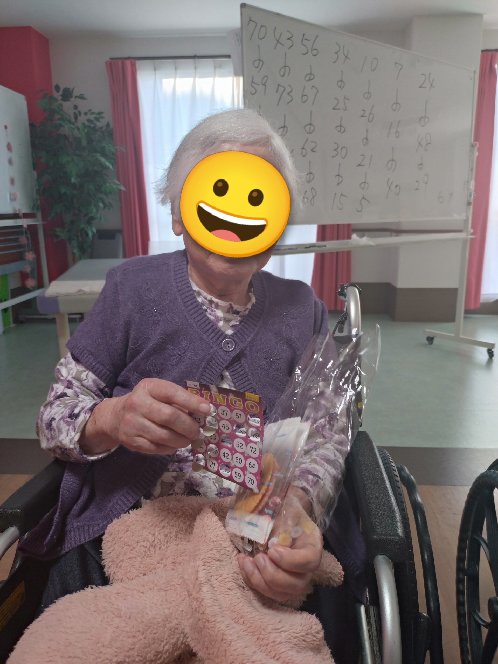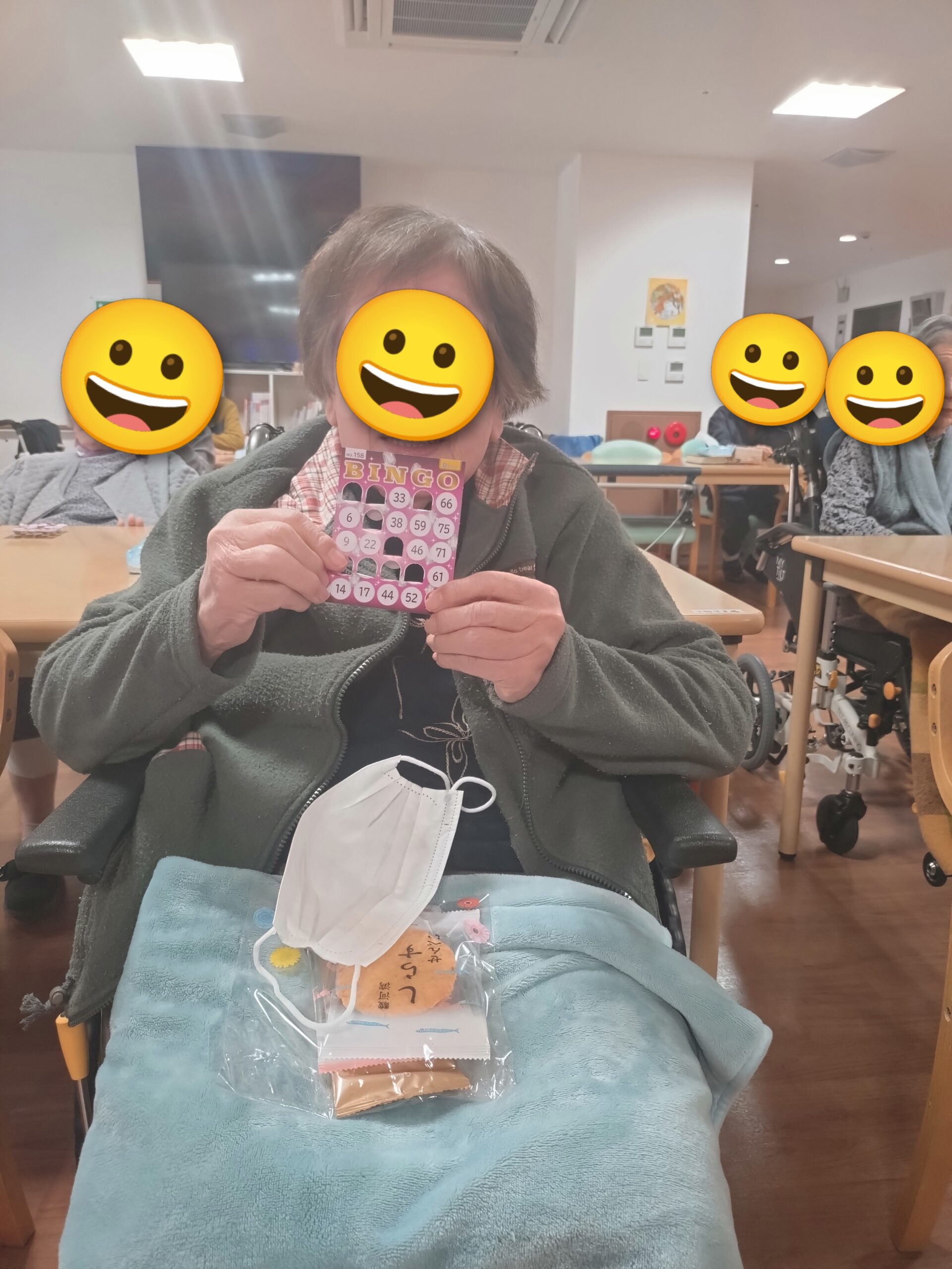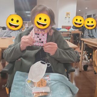 本日のレクリエーションはビンゴゲームを開催しました😊皆様「リーチやで😊」「また開いたわ😛」「こんなけ開いたのに揃わんわ😖」など楽しい声が響いていました😊上位5名にはお菓子の景品があり、喜んでおられました🥳