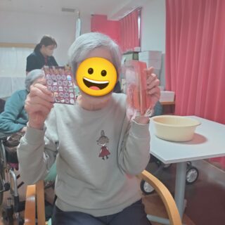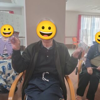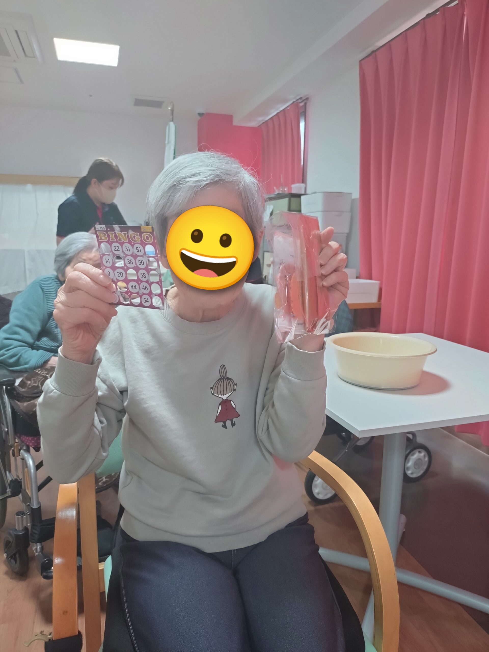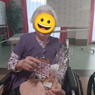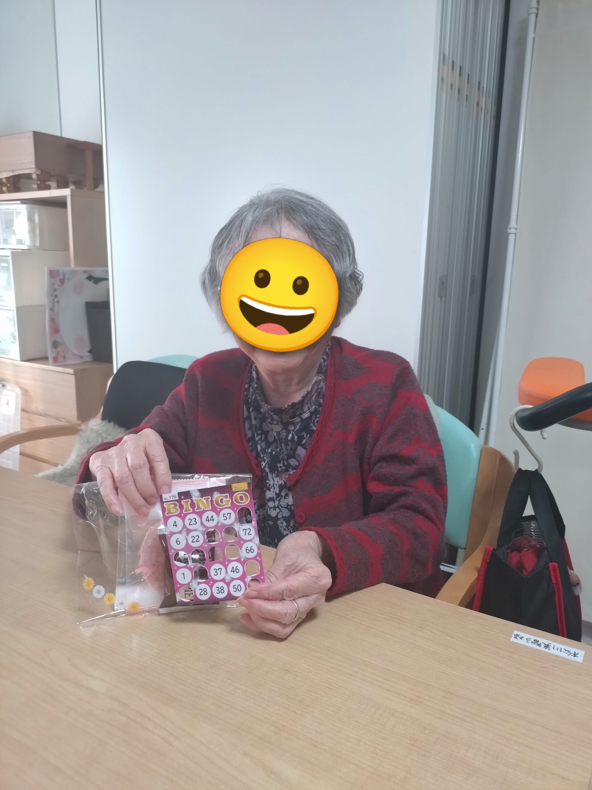 本日のレクリエーションはビンゴゲームを開催しました😊皆様「リーチやで😊」「また開いたわ😛」「こんなけ開いたのに揃わんわ😖」など楽しい声が響いていました😊上位5名にはお菓子の景品があり、喜んでおられました🥳
