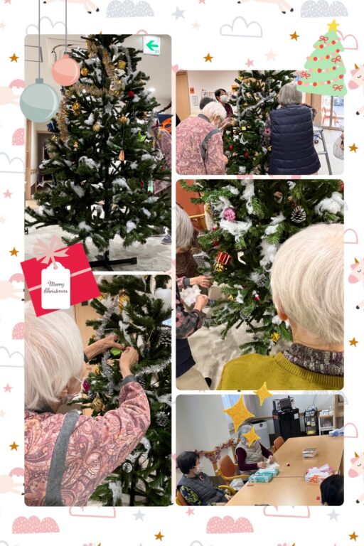 「ここに付けた方が良いんちゃう?」「上の方届かへんからあそこに付けて~」とこだわりが感じられ、とても素敵なクリスマスツリーが完成しました