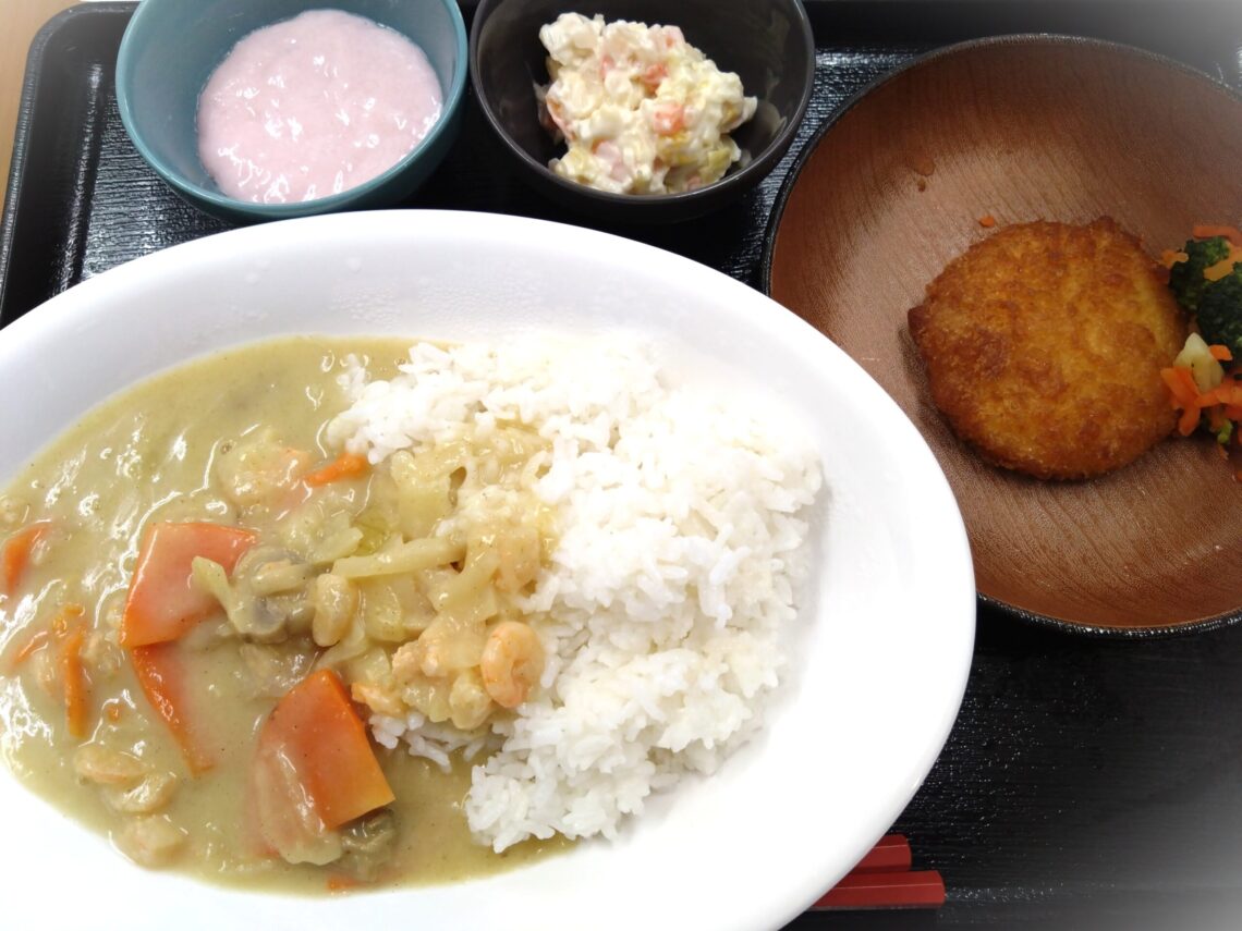 海老クリーミーカレー コーンコロッケ コールスローサラダ 苺ムースです😋