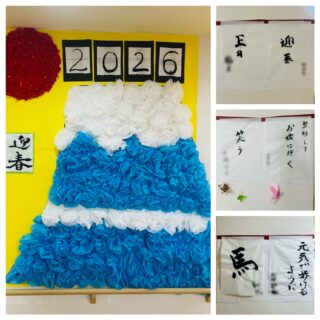 出来上がった書初めはフロアに飾り、あたたかな空間になりました♪