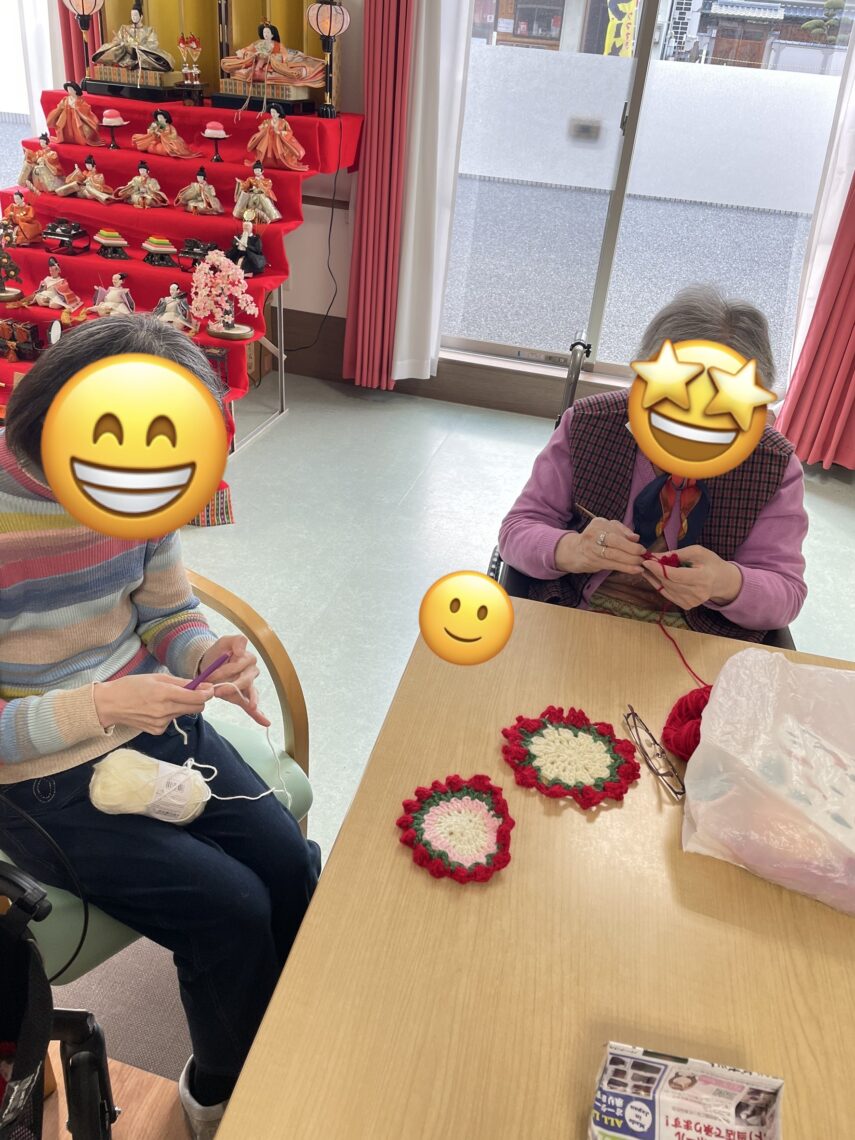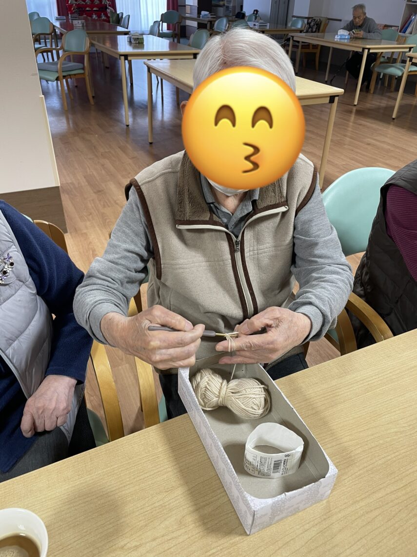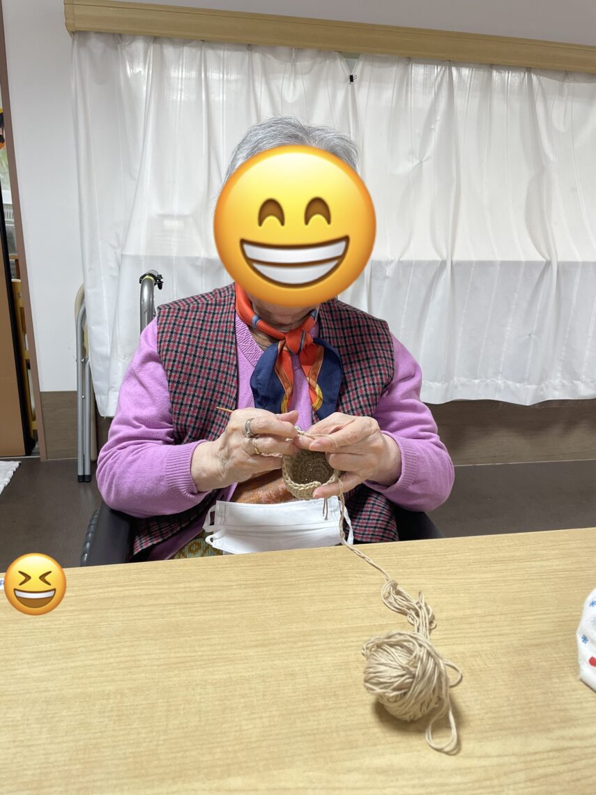 皆様黙々と編み物をしておりすごく手先が器用な事にビックリ🫢1人が編み物をしていると『私もしたいわー』などの声があり今では編み物グループが出来て作品が出来ると寄付して下さり飾ってます😍